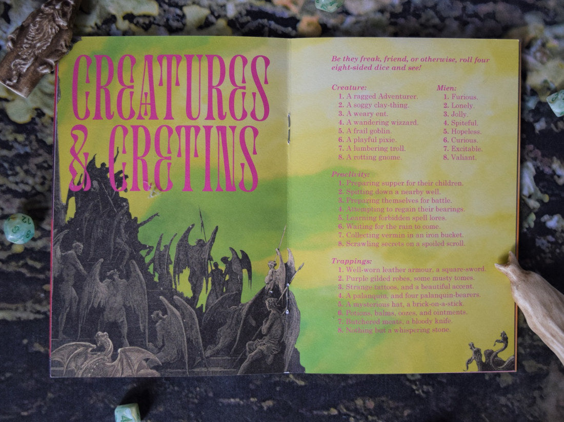 CYST is a game about making your own fantasy world! Jam-packed with D8 tables for you to roll on, create your own settings, adventures, monsters, dungeons, treasures, and heroes! Once your world is complete, get a few friends together or explore it on your own! CYST includes an accessible coin-flip system to add peril and wonder to your adventures!