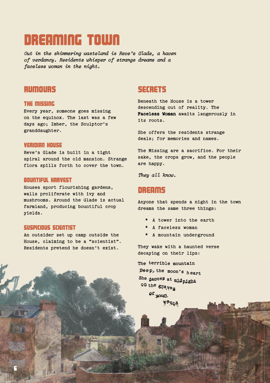 Terrible nightmares plague the residents of Reve’s Glade. People go missing on the full moon, virulent fauna spreads over the town, and a strange wind howls from the derelict mansion at the town’s heart. Enter the overgrown halls of Viridian House, uncover its secrets, and descend past the thresholds of reality to the Mountain Underground.